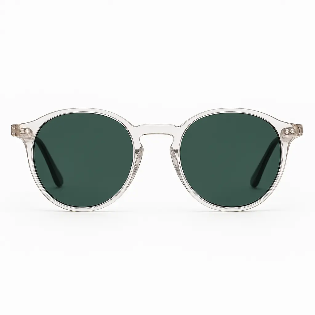 Lunettes de soleil rondes avec monture transparente et verres verts polarisés. Style moderne, confort assuré et protection UV. Livraison rapide au Maroc avec paiement à la livraison.