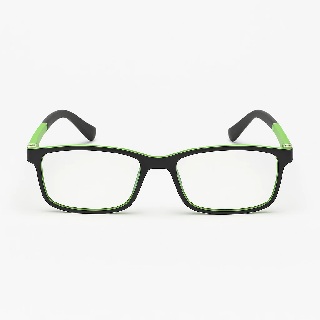 Lunettes de vue enfant rectangulaires noir et vert, modernes et confortables. Monture légère et résistante pour un usage quotidien. Technologie anti-lumière bleue pour protéger les yeux face aux écrans. Livraison rapide au Maroc avec paiement à la livraison.