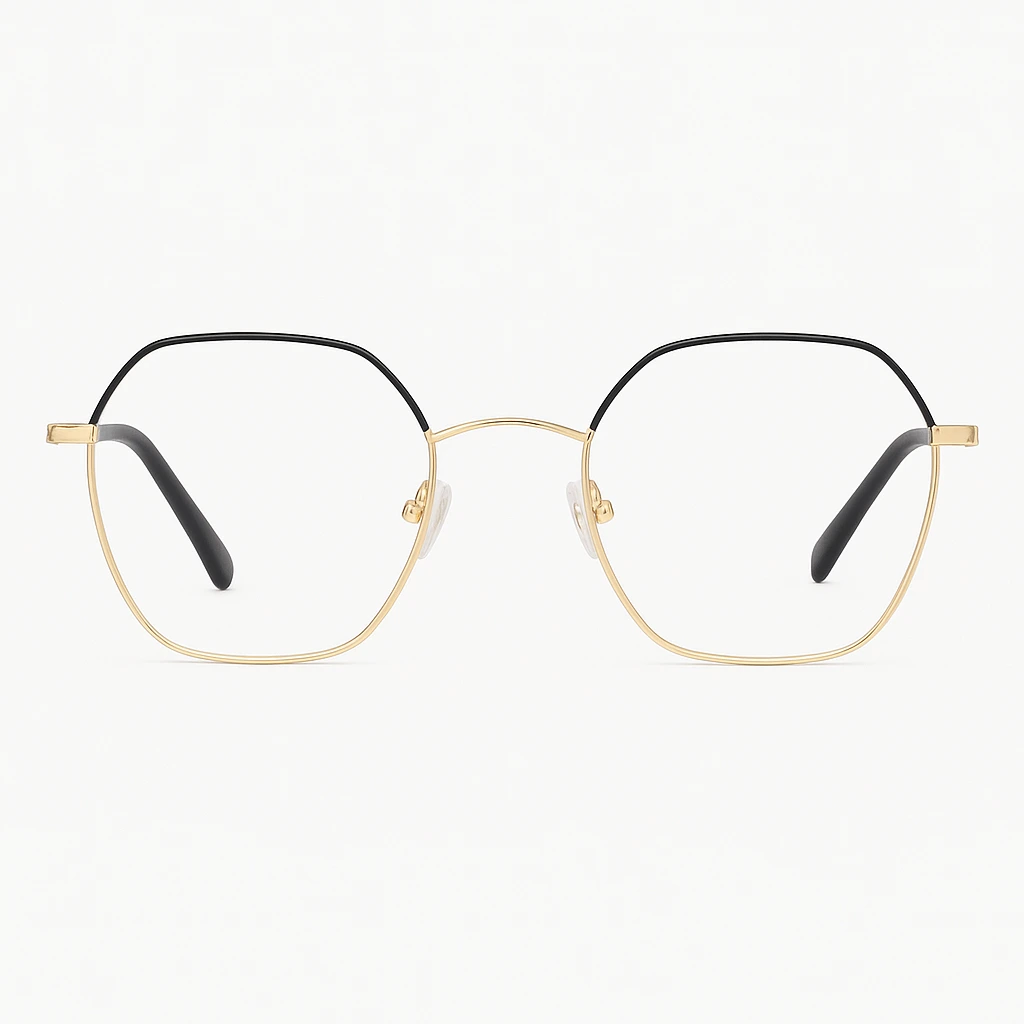 Lunettes de vue femme en métal doré et noir au design hexagonal. Protection anti-lumière bleue, confort optimal et livraison rapide au Maroc avec paiement à la livraison.