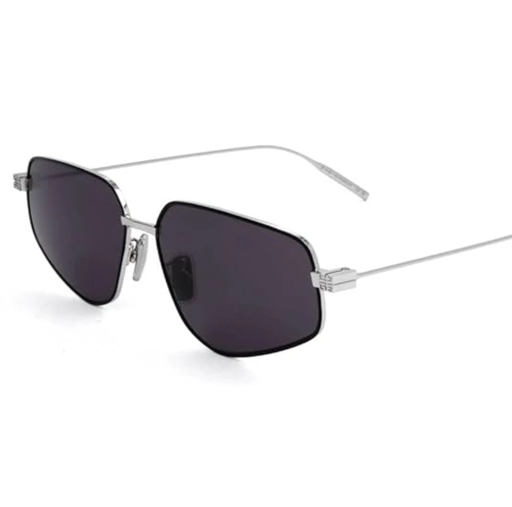 Lunettes solaires homme style Givenchy métal argenté avec verres noirs UV400. Élégantes, légères et protectrices. Livraison rapide au Maroc.
